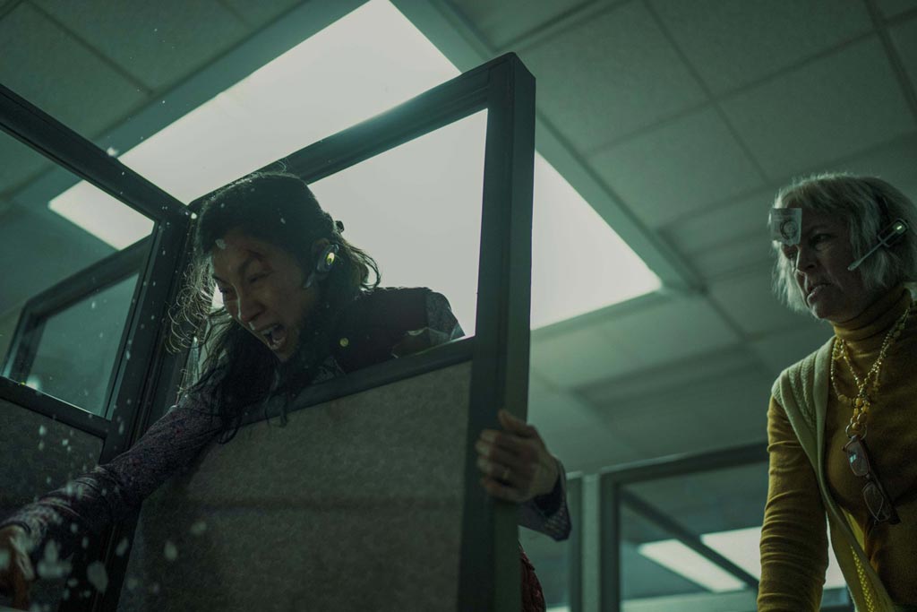 คุณ D’Mello กล่าว “ฉากที่บ้าบอที่สุดคือตอนที่ Evelyn เจอกับ Jobu ครั้งแรกแล้วเกิดโกลาหลข้ามมัลติเวิร์ส” ทีมของเขาต้องการภาพและฟุตเทจที่เป็นเอกลักษณ์ เพื่อขยายความสิ่งที่ Jobu พูดในฉากนี้